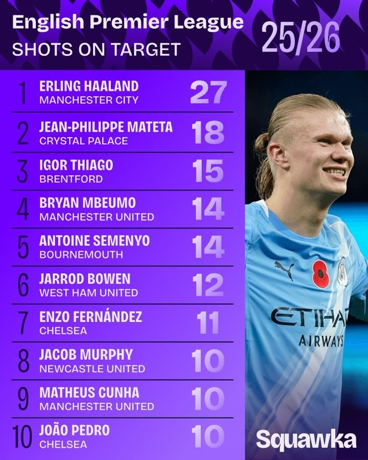 Ngày 11 tháng 11: Premier League đã diễn ra được 11 vòng đấu. Squakwa cũng thống kê số cú sút trúng đích ở Premier League mùa này, và Haaland dẫn đầu.