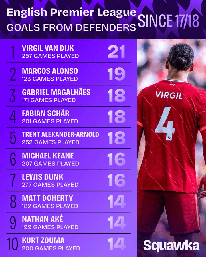 Hupu ngày 19 tháng 11 Theo thống kê từ công ty dữ liệu Squawka, kể từ mùa giải 2017/18, hậu vệ Premier League ghi nhiều bàn thắng nhất là trung vệ Van Dijk của Liverpool. Cầu thủ người Hà Lan đã chơi 257 trận trong giai đoạn này và ghi được 21 bàn thắng, đứng đầu trong số những cầu thủ ghi bàn cho các hậu vệ.