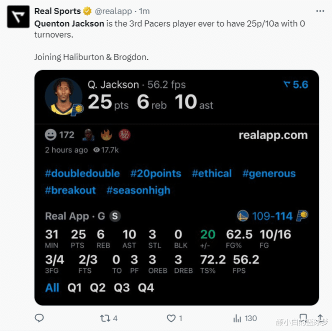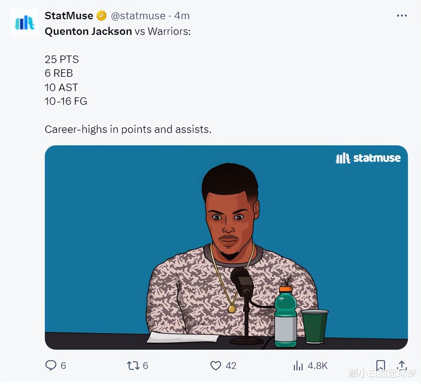 Trong 8 phút vừa qua, Jackson đã thực hiện 5/5, 2 trong 2 quả ba điểm, 12 điểm, 2 rebound, 1 kiến tạo và 1 cướp bóng, với tỷ lệ sút trúng đích là 110%.